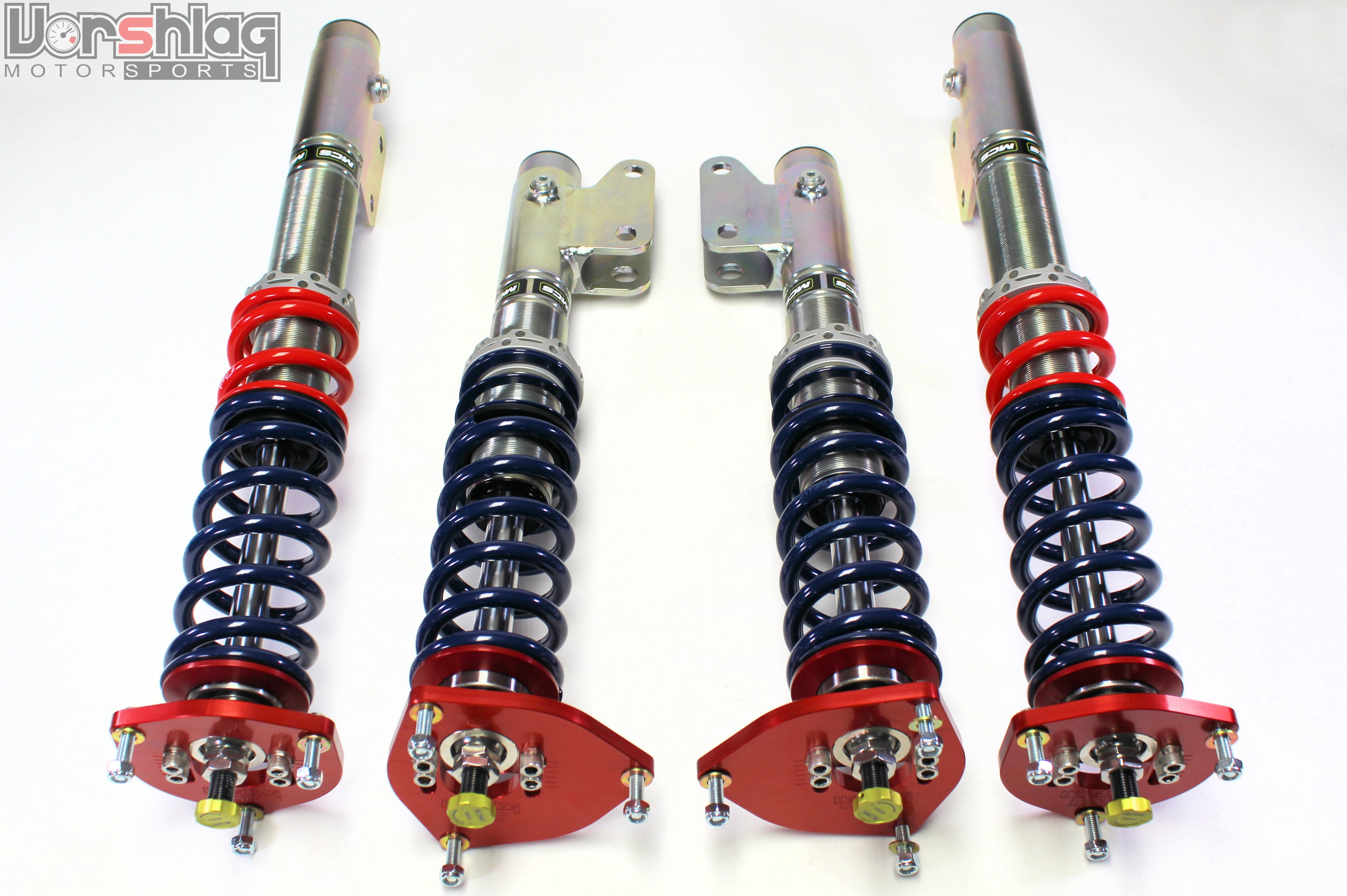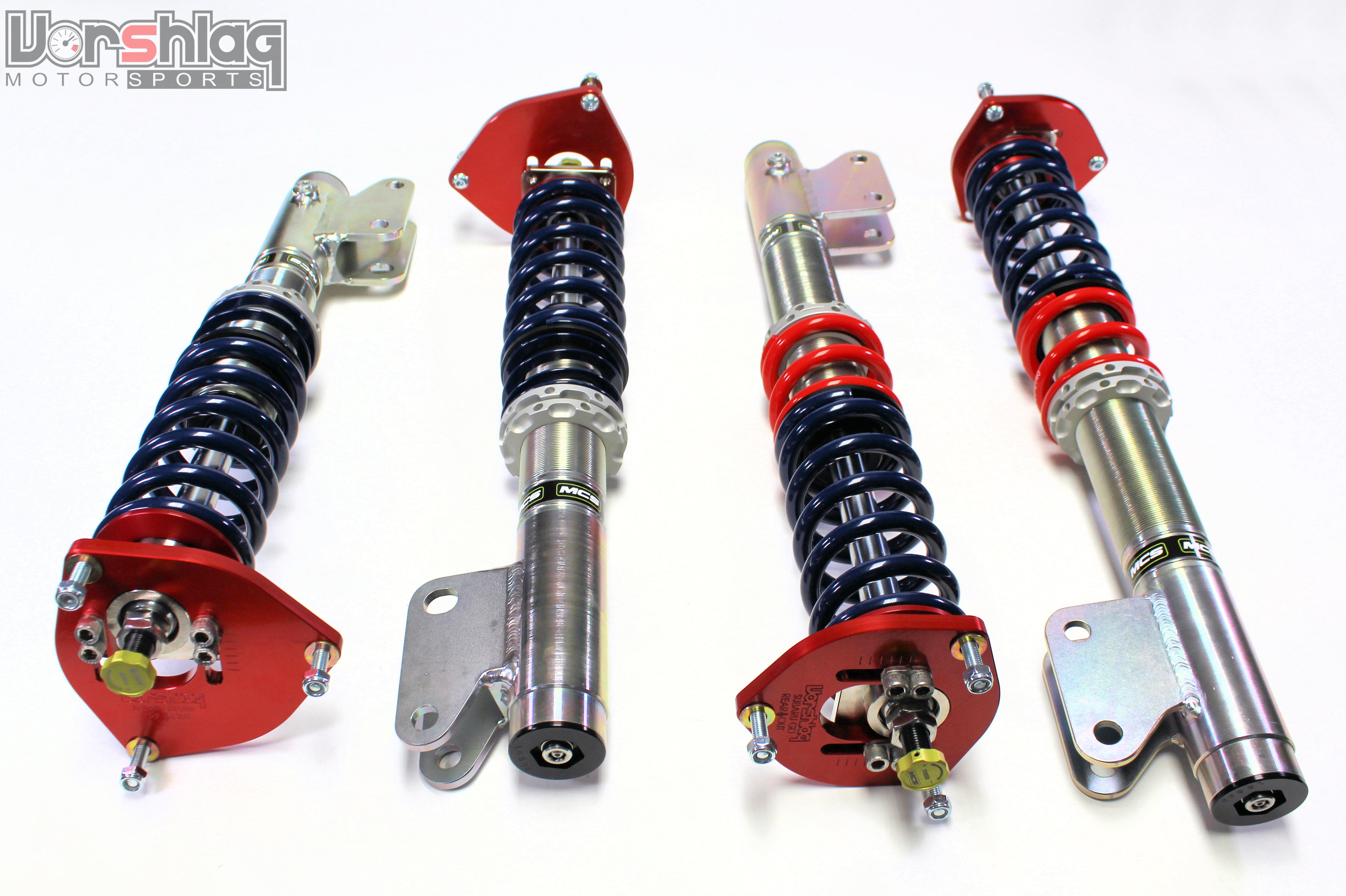 SPRING RATES : While MCS provides you with the dampers only, Vorshlag offers the unique option for racers to pick their own front and rear spring rates at a reduced cost. These options will include new Hyperco or Eibach springs from our recommended packages. The spring options listed include our GT package for daily driven cars, the GTS package for street cars that are also used in autocross and/or track events and the GTR package for race cars that predominantly see track use. We offer these without tender springs as a cost savings measure, or with tender springs on the rears to get the most from the MCS dampers. If you would like to order custom rates not listed here, please give us a call. This can be arranged for typically no extra cost.